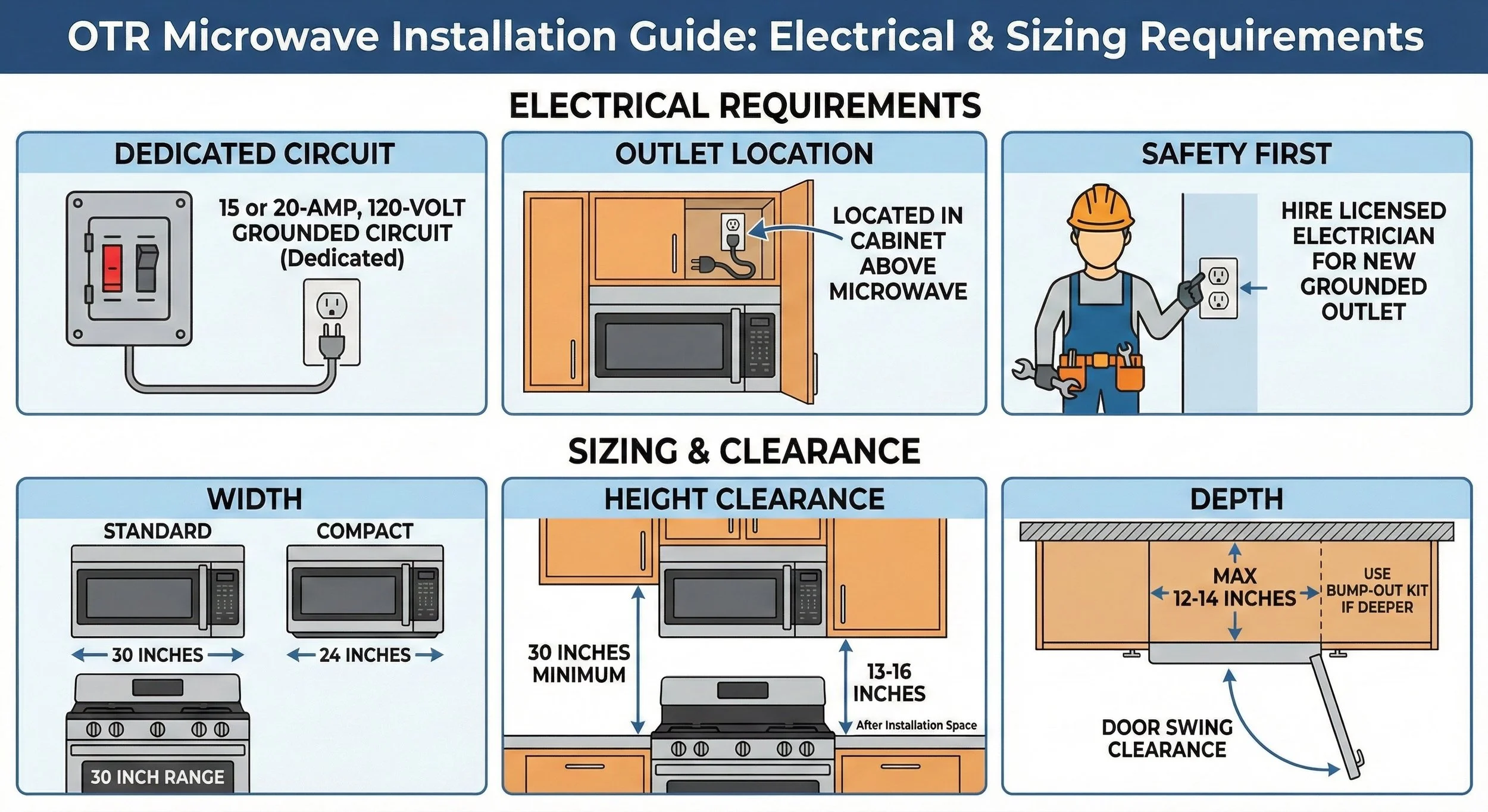 Dedicated Circuit: Most OTR microwaves require a dedicated 15 or 20-amp, 120-volt grounded circuit.
