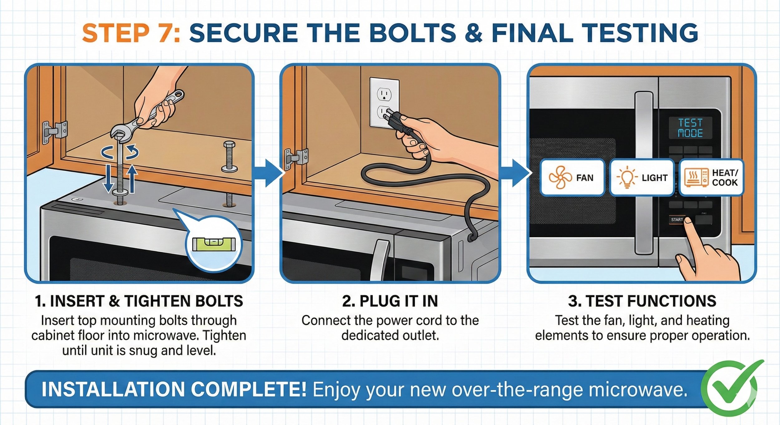 Insert the top mounting bolts through the cabinet floor and into the top of the microwave. Tighten them until the unit is snug and level. Plug it in and test the fan, light, and heating elements.
