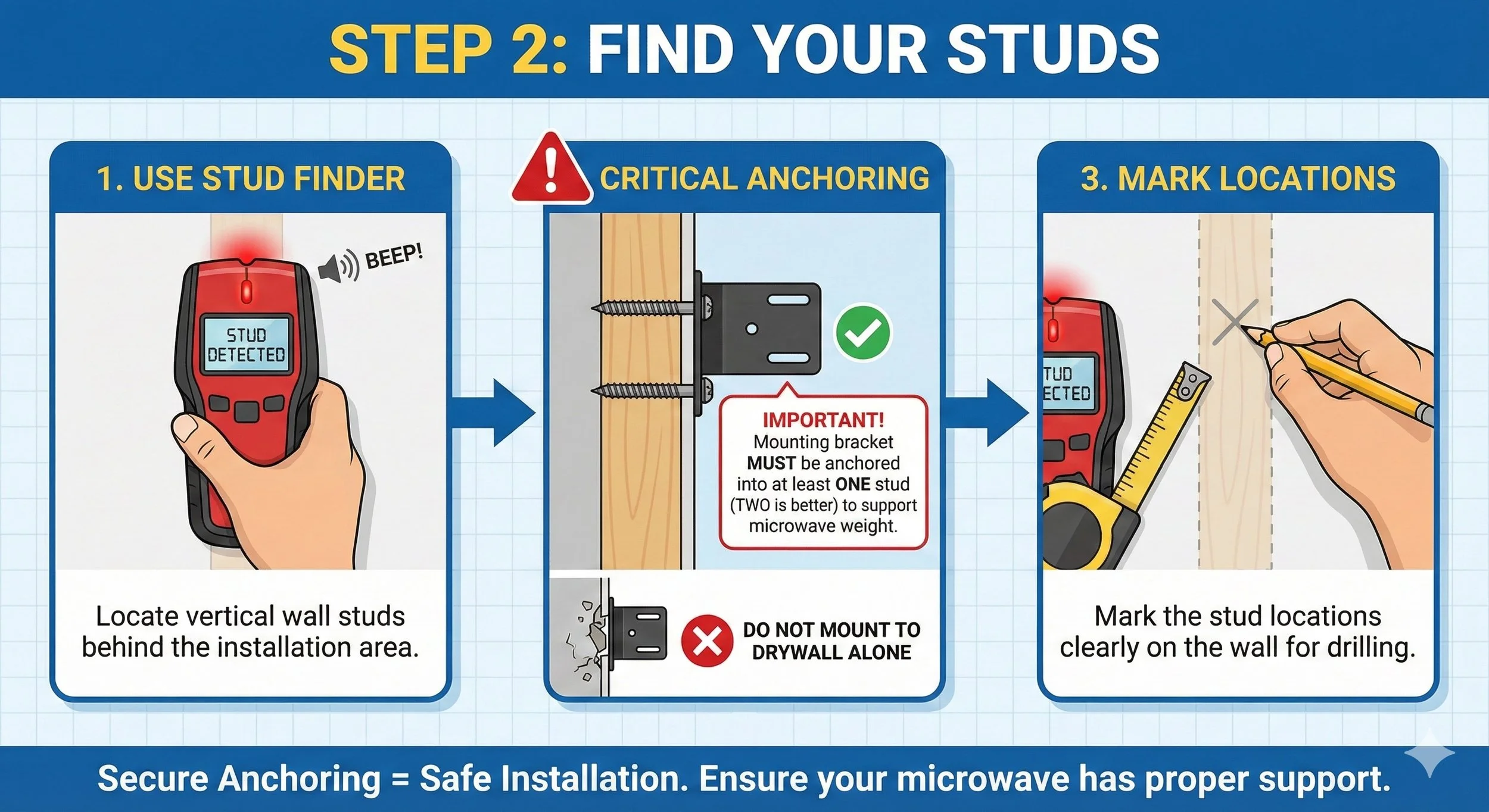 Use your stud finder to locate the vertical wall studs behind the installation area. Important: Your mounting bracket must be anchored into at least one stud (two is better) to support the weight of the microwave. Mark these locations clearly.