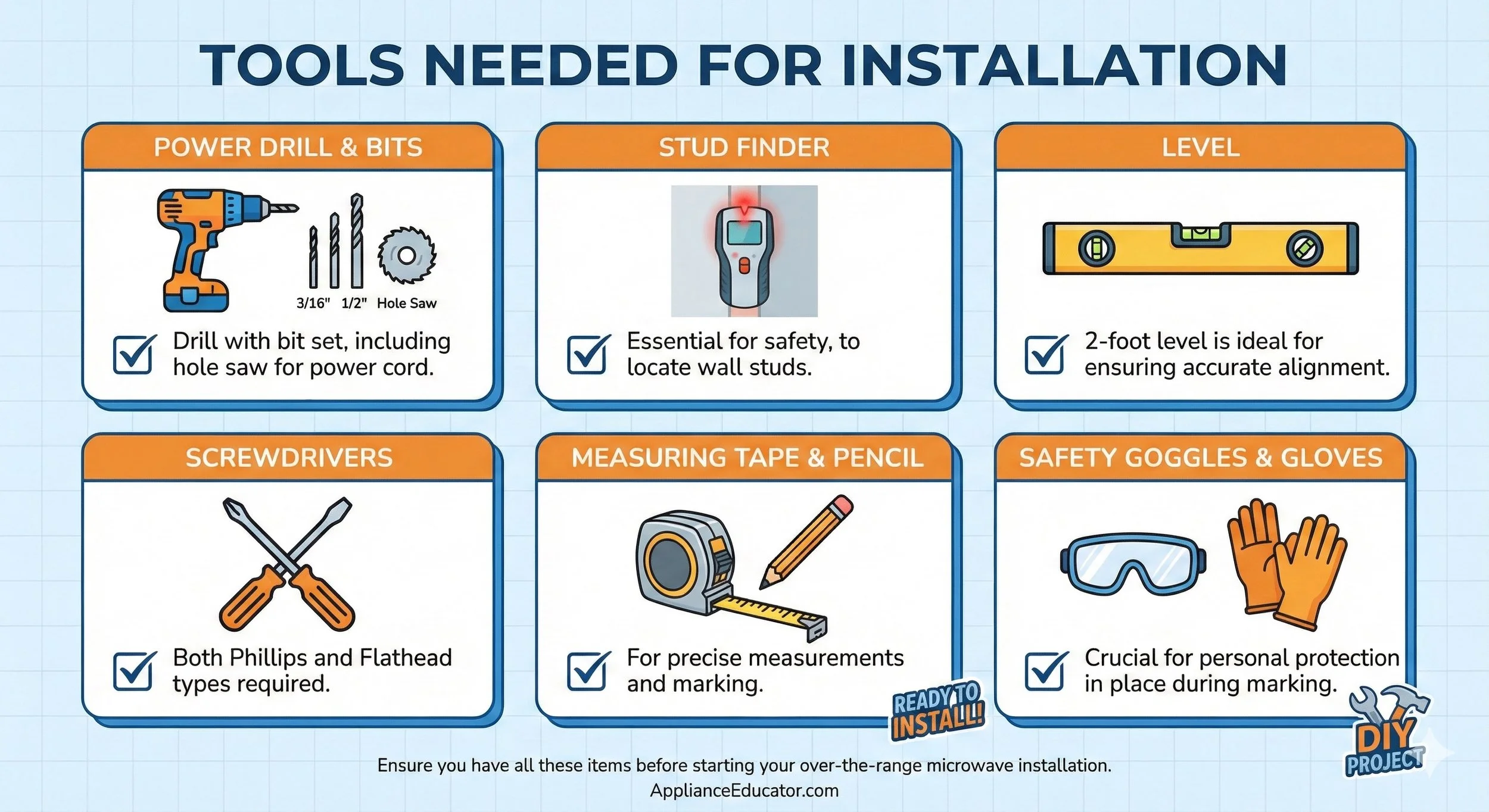 Don’t start the job only to realize you’re missing a 1/2-inch drill bit! Gather these items first: